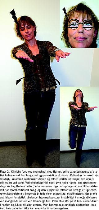 Spontan horisontal-tortionel nystagmus mod den raske side, med illusorisk bevægelse af omgivelserne (oscillopsi). Nystagmus forstærkes bag Bartels/Frentzels brille og bliver kraftigere eller svagere ved blikretning mod henholdsvis hurtig eller langsom nystagmusfase. Ved fiksation svækkes nystag-musamplituden, dvs. Bartels/Frentzels briller er påkrævet (Figur 2).