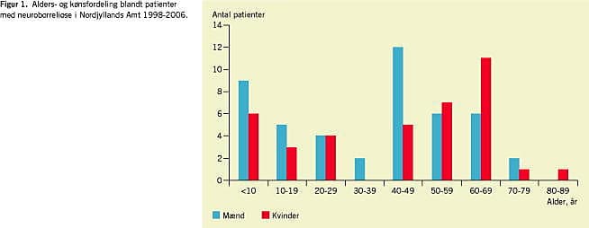 Infektion med Borrelia sp. er almindelig i Danmark, og de fleste tilfælde af primær hudinfektion (erythema migrans) helbredes med peroral penicillin. Et mindretal af tilfældene udvikler spredning af infektionen til centralnervesystemet (neuroborreliose) med varierende, eventuelt kroniske, symptomer, såfremt der ikke gives behandling. Neuroborreliose er anmeldelsespligtig i Danmark, og der anmeldes årligt ca. 100 tilfælde [1]. Der foreligger en nylig dansk klinisk retningslinje angående sygdommens diagnose [2] samt en tidligere gennemgang af neuroborreliose fra Danmark på baggrund af indsendte prøver til Statens Serum Institut 1985-1990 [3], men der er ikke siden lavet en populationsbaseret oversigt over sygdommen. Vi har derfor fundet det relevant at foretage en gennemgang af alle tilfælde i Nordjyllands Amt over en afgrænset årrække med henblik på diagnostik, behandling og resultater.