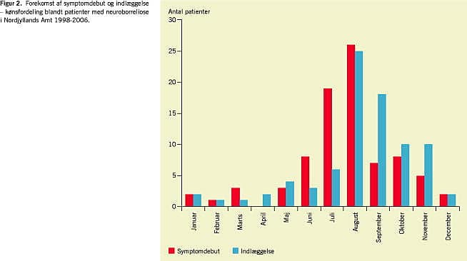 Der var en tydelig sæsonvariation for både symptomdebut og indlæggelsesårstid, hvilket peger på, at langt hovedparten af patienterne fik symptomdebut i perioden fra juni til november måned med en mindre forskydning til højre i den efterfølgende indlæggelse (Figur 2). Dette er foreneligt med en relativ kort periode fra smittetidspunkt til sygdomssymptomer, og det taler imod en årelang inkubationstid, hvor et jævnt mønster året rundt ville være fremherskende. Aldersfordelingen viste en højere forekomst af neuroborreliose hos børn og ældre end hos de 20-40-årige (Figur 1). En sådan fordeling, som også er vist andetsteds [3, 5], kan skyldes forskelligheder i eksposition for skovflåtbid og muligvis et svagere immunforsvar hos ældre.