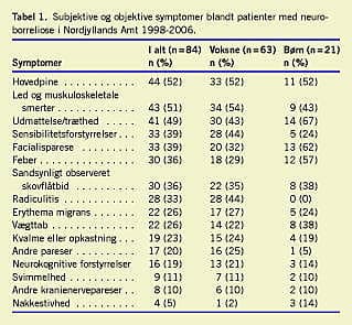Konklusion: Der findes ikke et gennemgående symptombillede hos patienter med neuroborreliose. Dog er der enkelte forskelle på, hvilke symptomer der optræder oftest hos børn og voksne. Tidlig diagnose og behandling viser sig muligvis at have en prognoseforbedrende effekt.