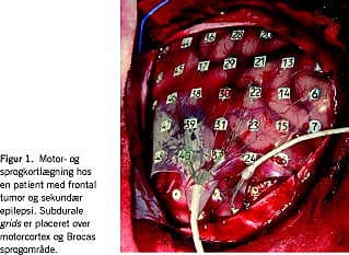 Monitorering med intrakraniale elektroder, enten som et netværk af elektroder (grid ) (Figur 1 ) til registrering af EEG direkte fra hjernens cortex (kortikografi) eller som dybdeelektroder, giver mulighed for præcis lokalisering af et epileptisk focus. Intrakraniale elektroder har i en årrække været anvendt peroperativt ved epilepsi- og hjernetumoroperationer, og inden for de seneste år har man kunnet foretage døgnmonitorering med intrakranialt EEG. Man kan desuden stimulere elektroderne i det indopererede grid og dermed foretage en funktionel kortlægning af cortex, hvilket udføres ved et tæt samarbejde mellem kliniske neurofysiologer, neuropsykologer og neurokirurger. Herved lokaliseres områder med vigtige funktioner såsom sprogområder og motoriske områder, og det operative indgreb kan planlægges, så mest muligt patologisk væv fjernes, og vigtigt væv bevares.