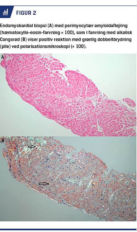 En endomyokardial biopsi viste kardial amyloidose ved bl.a. alkalisk Congorødfarvning (Figur 2). Immunfarvningen tydede på amyloidaflejring med lambdamonoklonalitet. Pga. presserende behandlingsbehov blev der ikke foretaget massespektroskopi, som kunne have sikret undertypen af amyloid hos patienten, som havde plasmacelledyskrasi.
