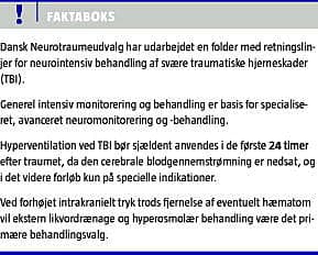 Induceret hyperventilation inducerer cerebral vasokonstriktion og dermed reduktion af det cerebrale blodvolumen og således også ICP. En balance mellem denne hensigtsmæssige effekt og den potentielle samtidige reduktion i CBF må findes. Som nævnt er CBF reduceret det første døgn efter et svært hovedtraume, og kraftig hyperventilation kan derfor udløse cerebral iskæmi (klasse III-evidens) [5, 6]. Hyperventilation bør ikke anvendes uden for en specialiseret neurointensiv enhed, hvor f.eks. måling af vena jugularis-saturation via retrogradt jugularisvenekateter eller måling af vævsilttension via cerebral iltelektrode [20] kan finde sted. Målet for PaCO2 er 4,5-5 kPa [4, 5].