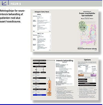 I Danmark forekommer der ca. 750 svære hovedtraumer pr. år. Mortaliteten er ca. 25-30% [1]. For de overlevende tilbagestår ofte en livslang nedsat funk-tionsevne. Behandlingen af svære traumatiske hjerneskader starter som en akut, livreddende behandling på traumestedet og fortsætter på neurointensivt afsnit i et samarbejde mellem intensivlæger og neurokirurger med det mål at minimere sekundær hjerneskade. Det er vist, at protokolleret behandling fører til bedre overlevelse og resultat efter svær hjerneskade, og at resultatet yderligere kan forbedres ved behandling på en specialiseret enhed [2-4]. Dansk Neurotraumeudvalg har udarbejdet retningslinjer for den neurointensive behandling af patienten med svært hovedtraume (Figur 1 ).