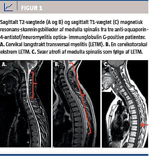 Det kliniske billede ved NMO omfatter TM, ON og hjernelæsioner [18]. Ved MR-skanning findes TM ofte lokaliseret cervikalt og i den øverste torakale del af medulla spinalis. Langstrakt vertikal udbredelse af medullalæsion over tre eller flere vertebrale segmenter er den vigtigste MR-skanningsmarkør for NMO og kaldes longitudinel ekstensiv TM (LETM) [14, 18, 19]. Ved MR-skanning af LETM ses disse med et højt signal på T2-vægtede billeder, og hvis undersøgelsen udføres i det akutte forløb, kan der på T1-vægtede billeder ses hypointensitet, ekspansivitet og opladning efter intravenøs kontrastinjektion (Figur 1). Høj cervikal TM kan involvere hjernestammen og føre til respirationssvigt og/eller vedvarende hikke og kvalme, der betragtes som typisk for NMO [18]. LETM leder ofte til svær symmetrisk paraplegi, sensorisk affektion kaudalt for læsionen og blæredysfunktion. Akut respiratorisk insufficiens er den hyppigste dødsårsag hos patienter med NMO [18]. LETM-læsioner ændres med tiden i form af recidiv, fragmentering eller atrofi [14, 20]. Fragmentering forekommer især under remission eller efter behandling med steroid [20]. En praktisk konsekvens af denne information er, at tidspunktet for MR-skanning af medulla er vigtigt for påvisning af LETM.
