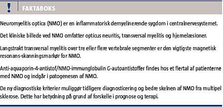 Neuromyelitis optica (NMO) er en inflammatorisk demyeliniserende sygdom (IDS) i centralnervesystemet (CNS), og den er næst efter multipel sklerose (MS) formentlig den hyppigst forekommende IDS i CNS [1]. NMO er en sygdom med autoimmune karakteristika og kan forekomme sammen med andre autoimmune sygdomme enten sekventielt eller samtidigt [2-4].