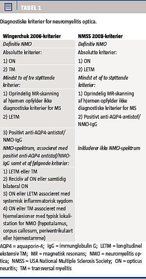 NMO er en alvorlig CNS-IDS med en mindre gunstig prognose end MS og med andre behandlingsmetoder, hvorfor en tidlig diagnose baseret på solide kriterier kan være afgørende. Forskellige sæt af kriterier for NMO er blevet indført i løbet af det seneste årti. Tre sæt af kriterier er blevet foreslået, heraf to af en forskergruppe fra Mayoklinikken [12, 18]. I 1999-kriterierne blev NMO beskrevet baseret på demografiske og kliniske oplysninger, herunder undersøgelse af cerebrospinalvæske (CSV) og MR-skanning fra 71 patienter. Disse kriterier havde begrænsninger, fordi et af de tre absolutte krav til NMO-diagnose var fravær af symptomer uden for n. opticus eller medulla [12]. I 2006 publicerede gruppen fra Mayoklinikken et nyt revideret sæt kriterier, der var baseret på en kohorte af 129 patienter, uafhængigt af 1999-kohorten [18]. Diagnosen blev etableret ved klinisk og radiologisk opfølgning efter sygdommens udbrud på et rent klinisk grundlag og uden kendskab til anti-AQP4-antistof/NMO-IgG-status. Når anti-AQP4-antistof/NMO-IgG-status blev medtaget i den endelige diagnose, blev der observeret bedre diagnostisk sensitivitet og specificitet [18]. Desuden blev begrebet NMO-spektrum baseret på tilstedeværelsen af anti-AQP4-antistof/NMO-IgG indført. NMO-spektret omfatter en ufuldstændig eller begrænset form for NMO, som består af LETM eller tilbagevendende TM og tilbagevendende eller samtidig bilateral ON. Derudover kan LETM og ON være associeret med systemisk inflammatoriske sygdomme eller hjernelæsioner (Tabel 1).