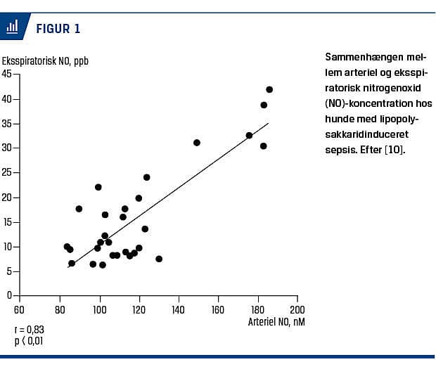 Sammen med øget karpermeabilitet og myokardiedepression synes nedsat hæmodynamisk modstand at spille en afgørende rolle for udviklingen af cirkulatorisk svigt og deraf følgende organhypoperfusion ved sepsis [3]. NO i plasma er forhøjet hos patienter med sepsis [5] og tilskrives en vigtig rolle i udviklingen af den vasodilatatoriske tilstand i kredsløbet [6]. Plasmakoncentrationerne af stabile NO-metabolitter, nitrit og nitrat (NOx), er også forhøjede ved septisk shock hos mennesker [7, 8] og dyr [9, 10]. I et studie med fuldt bedøvede, endotrakealt intuberede, mekanisk ventilerede hunde (n = 6) inducerede man sepsis med intravenøs injektion af Escherichia coli-endotoksinet lipopolysakkarid (LPS) og målte 30 minutter senere signifikant forøgede NO-koncentrationer både arterielt og i eksspirationsluften. NO-koncentrationerne vedblev at være forhøjede sammenlignet med både baseline