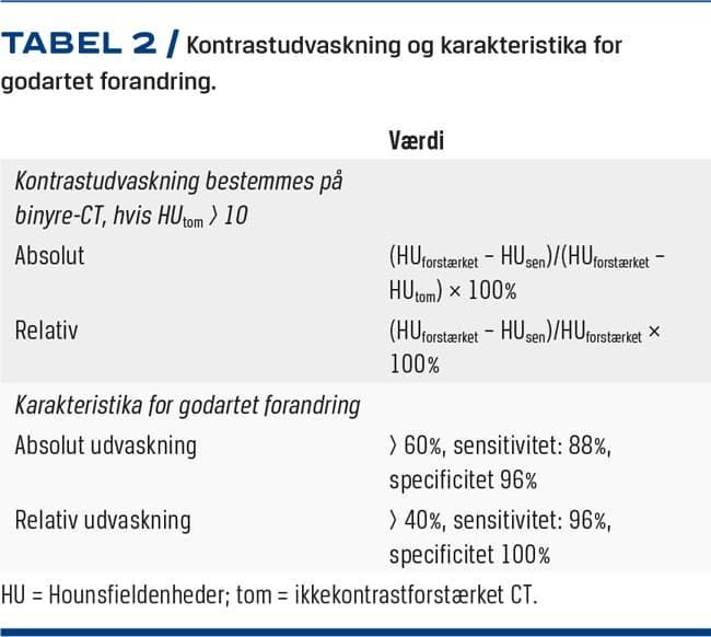 Ca. 30% af godartede binyretumorer har HUtom > 10 pga. lavt fedtindhold. CT-bestemt kontrastudvaskning rejser mistanke om malign tumor ved absolut udvaskning < 60% eller relativ udvaskning < 40% (Tabel 2). Ved kontrastudvaskning kan man således skelne fedtfattigt adenom fra malignsuspekt tumor med høj NPV, men lavere positiv prædiktiv værdi (PPV), med risiko for unødvendig operation [17]. Performance er ikke ens for forskellige kræfttyper, og falsk negative (falsk godartede) ses ved metastaser fra nyrekræft og hepatocellulært karcinom [16]. Tillige vil ikkehomogene tumorer med cyster, nekroser, blødning og kalcifikationer give risiko for ikkevalide resultater. Da kontrastudvaskning aldrig er valideret i en regelret BI-kohorte, er falsk positiv-raten for BI omdiskuteret, og i enkelte lande har man fravalgt brug af kontrastudvaskning.