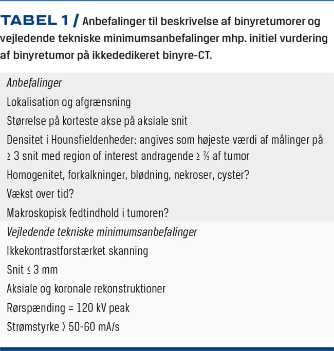 Høj snittykkelse (> 3 mm), lav strømstyrke (< 50-60 mA/s) samt høj rørspænding (> 120 kV peak (kVp)) øger risikoen for falsk lave HU-værdier. Effekten af lavere rørspænding (< 120 kVp) er uforudsigelig og kan lede til såvel falsk positive som negative [19]. Ved korrekt måling af HU skal region of interest andrage ca. to tredjedele af tumoren og undgå kant, nekroser, blødning, cyster og kalcifikationer. Tekniske krav til bedømmelse af binyretumorer på CT foretaget på anden indikation er angivet i Tabel 1.