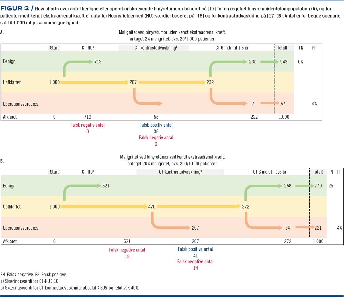 I den følgende gennemgang kan det være en fordel at følge Figur 2 og se det falsk positive og falsk negative antal i hhv. en regelret BI-population (Figur 2A) og i en population med ekstraadrenal kræft (Figur 2B).
