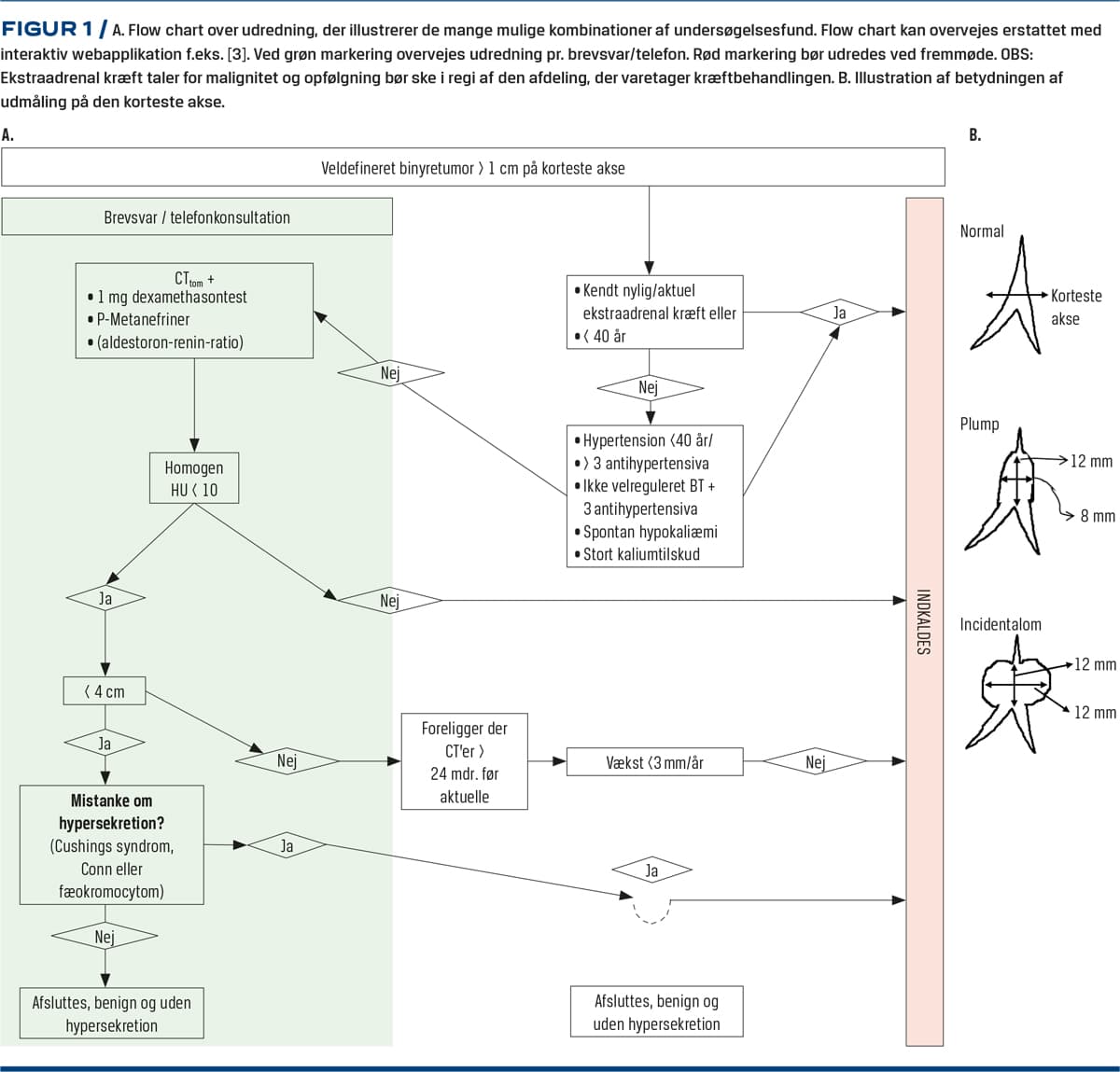 BI er en veldefineret tumor > 1 cm på den korteste akse på et aksialt snit [5] (Figur 1B) i en binyre af i øvrigt normalt udseende hos borgere uden aktiv kræftsygdom. En plump/hypertrofisk binyre er ikke patologisk. Binyren består klassisk af to ben (bredde 2-9 mm) og et korpus (bredde 4-15 mm) [6, 7] med en længde på 2-4 cm i aksialt plan. Binyrebarken producerer aldosteron, kortisol og adrenale androgener, mens binyremarven producerer adrenalin og noradrenalin. Patogenesen bag BI er omdiskuteret [8-11], og den genetiske og epigenetiske baggrund er kun begyndt at blive afdækket [12, 13] og er specielt uklar for ikkehormonproducerende BI.