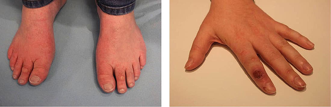 Patienten henvendte sig med hævede og røde fødder, efter at hun nogle uger forinden havde fået uømme noduli på fingrene. Podning viste, at det drejede sig om orf.
