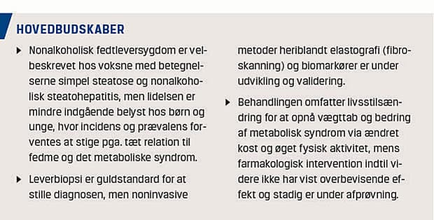 I denne artikel beskriver vi epidemiologi, patofysiologi, diagnostik, screening og behandling af pædiatrisk NAFLD og NASH.