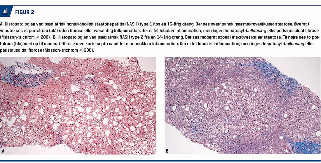 Af 100 patienter havde 17% forandringer som dem, man typisk ser hos voksne med steatose, ballooning og perisinusoidal fibrose, men uden portale forandringer (type 1). Type 2 fandtes hos 51% med steatose i zone 1 og portalinflammation, men uden ballooning eller perisinusoidal fibrose (type 2) [5]. Resultaterne af andre studier har bekræftet denne portale/periportale form for NASH, der særligt ses hos præpubertale børn [14, 15]. Der er konsensus om, at leverbiopsier fra børn med NAFLD viser makrovesikulær steatose (Figur 2A) og portal mononuklear inflammation, mens hepatocyt-ballooning ses sjældnere [5]. Det kan hos børn gøre det vanskeligt dels at skelne NAFL fra NASH, dels at anvende gængse NAFLD-histopatologiske scoringssystemer. Ligeledes er det velbeskrevet, at der hos børn med steatose uden ballooning kan udvikles væsentlig (peri)portal fibrose (Figur 2B) [5].