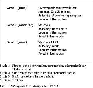 NASH har været kendt siden 1980, hvor Ludwig et al (1) beskrev en tilstand med histologisk steatohepatitis hos patienter, som man ikke havde nogen klinisk formodning om havde et alkoholoverforbrug. Det er en klinisk og patologisk diagnose, hvor anden årsag til kronisk transaminasæmi herunder stort alkoholforbrug er udelukket. Diagnosen stilles ved leverbiopsi, hvor man i dag er enige om en række morfologiske kriterier (2) (Fig. 1 ).