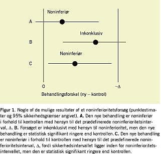 Alle påstande om effekt af nye behandlinger baseret på disse forsøg skal tolkes med varsomhed. Hvis materialet er stort, eller Δ er stor, eller hvis variationen i målingerne er mindre end forventet, kan der opstå den forvirrende situation, at den nye behandling er signifikant ringere end kontrollen, til trods for at resultatet enten er formelt inkonklusivt (dvs. den nedre sikkerhedsgrænse krydser linjen for noninferioritet) eller endda viser noninferioritet (dvs. sikkerhedsintervallet ligger inden for noninferioritetsintervallet) (Figur 1 ). I disse situationer kunne klinikerne lægge vægt på den signifikante forskel og undlade at bruge den nye behandling, idet Δ ofte er langt større, end hvad klinikere og myndigheder ville betragte som en minimal, relevant klinisk forskel [7].