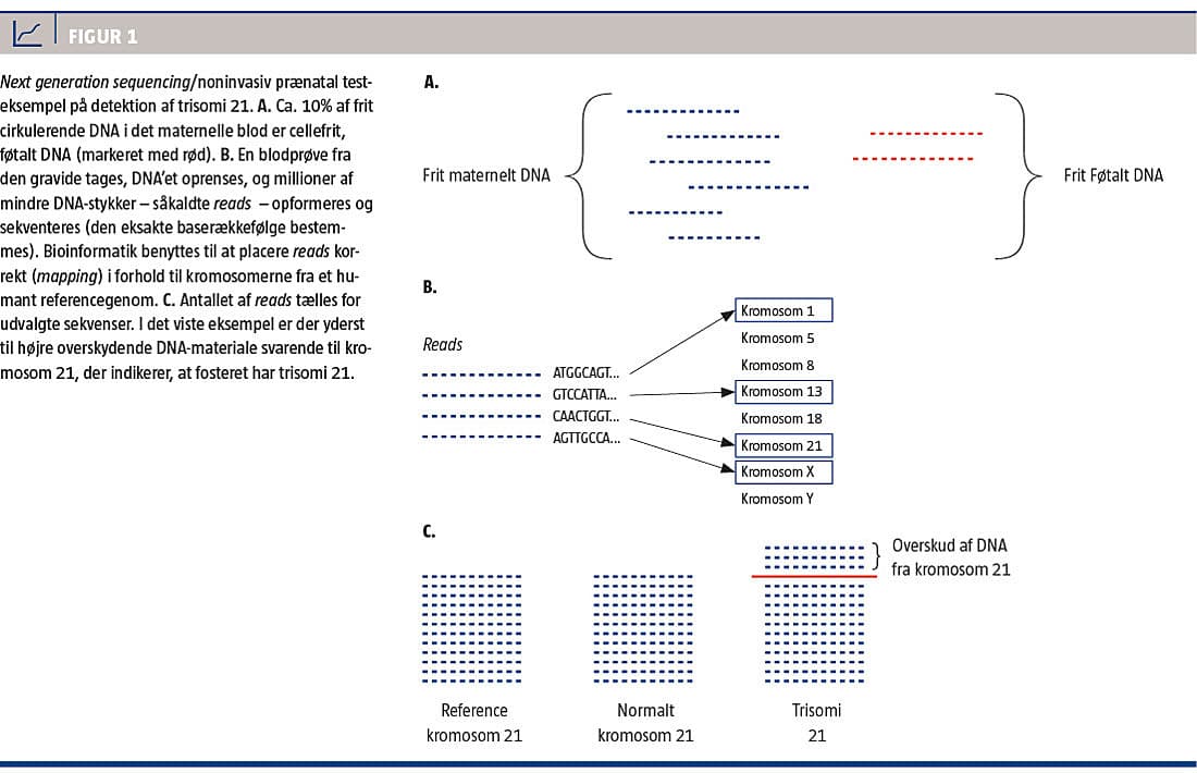 Selve testen bygger på next generation sequencing [1, 4], hvor man opformerer millioner af mindre stykker DNA, som er isoleret fra blodet (Figur 1). Dernæst bestemmes den præcise rækkefølge af baserne i DNA’et, også kaldet sekventering. Alle disse stykker af DNA-basepar – såkaldte reads – sammenlignes med et humant referencegenom (det samlede genmateriale fra et menneske), og pga. den unikke rækkefølge af basepar sorteres DNA-stykkerne svarende til de forskellige kromosomer. Antallet af reads for hvert kromosom sammenholdes med det antal, man finder hos en gravid kvinde med et foster med normal kromosombesætning, og hvis antallet af reads for et bestemt kromosom overstiger det normale – f.eks. for kromosom 21 – tyder det på overskydende kromosommateriale.