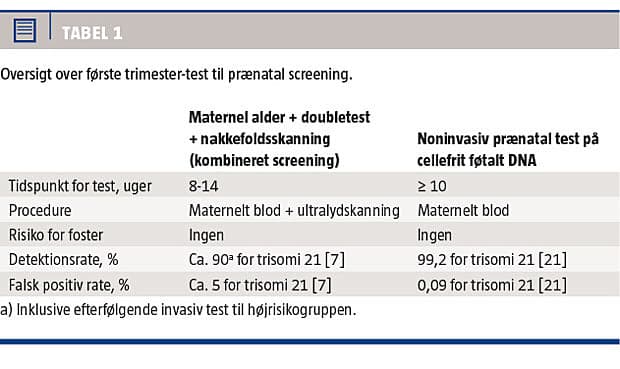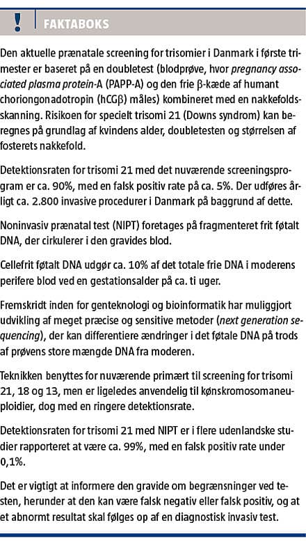 Den genteknologiske udvikling har i de seneste år gjort det muligt at undersøge et fosters kromosomer ud fra en blodprøve fra den gravide kvinde [1], hvilket er et gennembrud inden for prænatal screening. Allerede i 1969 fandt man føtale celler i moderens blod [2], og i 1997 fandt man cirkulerende fragmenteret cellefrit føtalt DNA, som stammede fra placenta, i det maternelle blod [3, 4]. Cellefrit føtalt DNA udgør ca. 10% af det totale frie DNA i moderens perifere blod ved en gestationsalder på ca. 10 uger [5]. Dette materiale har vist sig at være meget velegnet til prænatal screening [1, 4]. Frit føtalt DNA elimineres meget hurtigt og er forsvundet fra moderens blod 1-2 dage post partum, hvilket betyder, at man ikke risikerer interferens med frit føtalt DNA fra en tidligere graviditet [4]. I bl.a. USA har man siden 2011 kunnet tilbyde kvinder med høj risiko for at få et barn med bl.a. Downs syndrom (trisomi 21) screening ved undersøgelse af cellefrit føtalt DNA [6]. Testen bliver udbudt af private laboratorier, og i flere andre lande – herunder Danmark – er der igangsat initiativer med henblik på snarlig ibrugtagning af metoden. Det er dog ikke fuldt afklaret, hvilken gruppe af gravide kvinder der bør tilbydes denne noninvasive prænatale test (NIPT), eller hvordan man med metoden bedst kan supplere de eksisterende screeningstilbud.