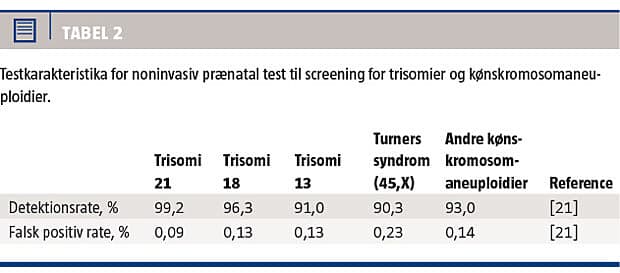 risiko for aneuploidier, dvs. en standardscreeningspopulation [6, 17-20]. I en metaanalyse af Gil et al er resultaterne af studier fra perioden januar 2011-januar 2015 af NIPT til screening for trisomi 21, 18 og 13 samt kønskromosom aneuploidier sammenfattet [21]. Detektionsraten for trisomi 21 var 99,2%, og falsk positiv-raten var 0,09% (Tabel 1). Detektionsraterne for trisomi 18 og 13 var henholdsvis 96,3% og 91,0%, og tilsvarende falsk positive rater henholdsvis 0,13% og 0,13% (Tabel 2). Detektionsraten for Turners syndrom var 90,3% (falsk positiv rate 0,23%) og for andre kønskromosomaneuploidier 93,0% (falsk positiv rate 0,14%). Der findes endnu kun få studier, hvori man har undersøgt testens værdi hos tvillinger, men det tyder på, at detektionsraten for trisomi 21 er noget lavere i tvillingegraviditeter end i singletongraviditeter [21].