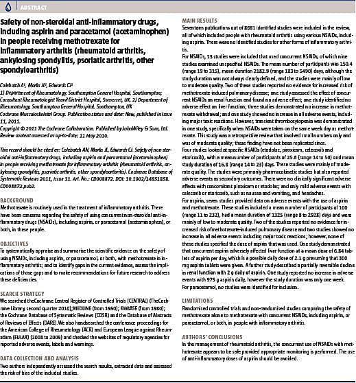 Colebatch AN, Marks JL, Edwards CJ. Safety of non-steroidal anti-inflammatory drugs, including aspirin and paracetamol (acetaminophen) in people receiving methotrexate for inflammatory arthritis (rheumatoid arthritis, ankylosing spondylitis, psoriatic arthritis, other spondyloarthritis). Cochrane Database Syst Rev 2011;(11): CD008872.