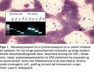 I: Yersinia pestis. En 21-årig indfødt mand blev indlagt i Tanzania på mistanke om byldepest. Patienten havde en uge inden indlæggelsen rejst 250 km fra et område med forekomst af pest. I aspiratet fra lymfeknuder fandtes talrige bipolært farvede, sikkerhedsnålslignende stave (Figur 1 ). Patientens symptomer progredierede hurtigt med tegn på sepsis og fulminant lungeinfektion. Mors indtrådte få timer efter indlæggelsen. År senere blev der ekstraheret DNA fra det oprindelige mikroskopipræparat, og ved polymerasekædereaktion (PCR) påvistes fire Y. pestis -specifikke sekvenser (Figur 1).