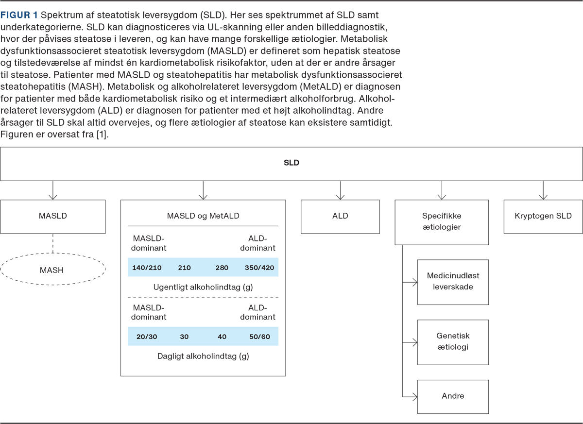 I 2023 har fedtleversygdom skiftet navn til steatotisk leversygdom (SLD), som refererer til sygdomme, hvor fedt (steatose) ophobes i levercellerne (Figur 1) [1]. SLD har flere underkategorier, bestemt af de tilgrundliggende ætiologiske faktorer. Patienter med kardiometaboliske risikofaktorer i form af overvægt, insulinresistens, diabetes, dyslipidæmi og hypertension samt et lavt indtag af alkohol kan diagnosticeres med metabolisk dysfunktionsassocieret steatotisk leversygdom (MASLD). Patienter med et længerevarende højt forbrug af alkohol kan diagnosticeres med alkoholrelateret leversygdom (ALD) uanset tilstedeværelsen af kardiometaboliske risikofaktorer. Endelig kan patienter med både kardiometabolisk risiko og intermediært alkoholindtag nu diagnosticeres med metabolisk og alkoholrelateret leversygdom (MetALD).