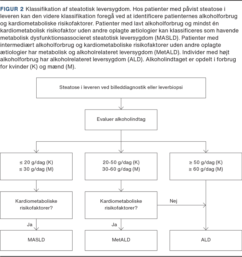 Som anført er MetALD en ny sygdomskategori til personer med leversteatose, som både har kardiometaboliske risikofaktorer og et intermediært alkoholindtag (Figur 1 og Figur 2). Alkoholindtaget hos personer med MetALD skal for kvinder være 20-50 g/dag, dvs. 1,5-4 genstande, og for mænd 30-60 g/dag, dvs. 2,5-5 genstande. MetALD er opstået som en konsekvens af den kliniske virkelighed, hvor mange patienter både har et betydeligt alkoholforbrug og samtidige kardiometaboliske risikofaktorer, og dermed risiko for mere alvorlig leversygdom.