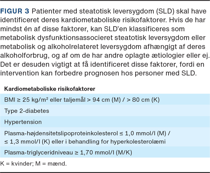 Diagnosen MASLD kræver ud over påvisning af mere end 5% steatose i leveren mindst én kardiometabolisk risikofaktor (Figur 3). Derudover forudsætter MASLD-diagnosen et dagligt alkoholforbrug ≤ 20 g/dag, dvs. 1,5 genstande, for kvinder og ≤ 30 g/dag, dvs. 2,5 genstande, for mænd. Hvis dette ikke er tilfældet, klassificeres patienten i enten MetALD-kategorien eller ALD-kategorien, afhængigt af forbruget af alkohol (Figur 1).