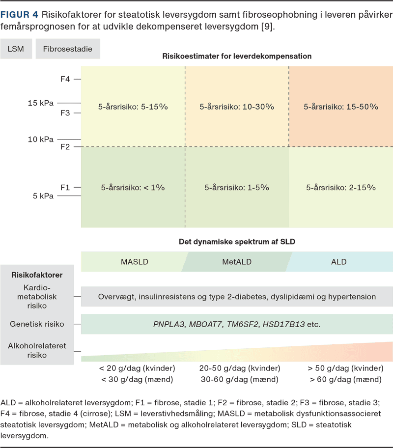 SLD er som nævnt en meget udbredt tilstand, og det anslås, at over en million danskere har enten MASLD, MetALD eller ALD. Fælles for alle underkategorier af SLD er, at der hos nogle personer med steatose er risiko for udvikling af en inflammatorisk reaktion, som sætter gang i fibrogenese i leveren. Fibrose er den faktor, som har størst indflydelse på prognosen hos folk med SLD, fordi fibrosen kan føre til levercirrose og nedsat leverfunktion [11], og hos personer med ALD vil fibrogenesen ske i et hurtigere tempo end hos personer med MetALD og MASLD (Figur 4). Det er derfor vigtigt at identificere patienter med leverfibrose så tidligt som muligt. Sundhedspersonale anbefales at bruge den hurtige og prisvenlige ikkeinvasive blodprøve Fibrosis-4 (FIB-4) [12], der kombinerer aspartat-aminotransferase, alaninaminotransferase, trombocyttal og alder for at finde folk med risiko for fibrose i leveren. Testen er implementeret i alle danske regioner, og internationale retningslinjer anbefales det at anvende den som den første screening hos personer med risikofaktorer, herunder type 2-diabetes (T2D), et BMI over 30 og hos folk med et intermediært til højt alkoholforbrug [12]. Hvis FIB-4-resultatet er < 1,30, er der ikke risiko for fibrose, men hvis FIB-4 er > 2,67, er der risiko for væsentlig fibrose, og patienten kan henvises direkte til yderligere udredning på en afdeling med hepatologisk ekspertise. Er FIB-4 mellem 1,30 og 2,67, anbefales i første omgang intervention rettet mod risikofaktorer, særligt livsstilsintervention via kost og motion, alkoholabstinens og forbedret kontrol af T2D, dyslipidæmi og hypertension [13, 14]. Efter seks måneders intervention anbefales det at gentage målingen og henvise til yderligere hepatologisk udredning, hvis FIB-4 stadigvæk er forhøjet eller i tvivlstilfælde.