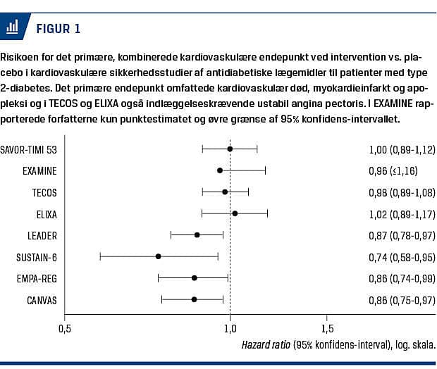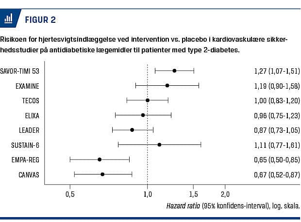 tioner er evidensen for en beskyttende effekt af intensiv glukosesænkning uklar [2]. Den klassiske antagelse om, at et fald i glukosekoncentrationen også må forventes at resultere i en bedret prognose, blev udfordret i 2007, da en metaanalyse viste en signifikant forhøjet risiko for myokardieinfarkt og en grænsesignifikant forhøjet risiko for kardiovaskulær død ved brug af rosiglitazon til patienter med type 2-diabetes [3]. I et efterfølgende, større, randomiseret studie kunne der ikke drages definitive konklusioner om risikoen for myokardieinfarkt, men man fandt dog en klart forhøjet risiko for hjertesvigt [4]. Den amerikanske Food and Drug Administration og siden European Medicines Agency besluttede på baggrund heraf at kræve en dybdegående undersøgelse af den kardiovaskulære sikkerhedsprofil ved nye antidiabetiske midler [5, 6]. Formålet med denne artikel er at gennemgå resultaterne af de efterfølgende gennemførte randomiserede studier af disse lægemidlers kardiovaskulære sikkerhedsprofil.