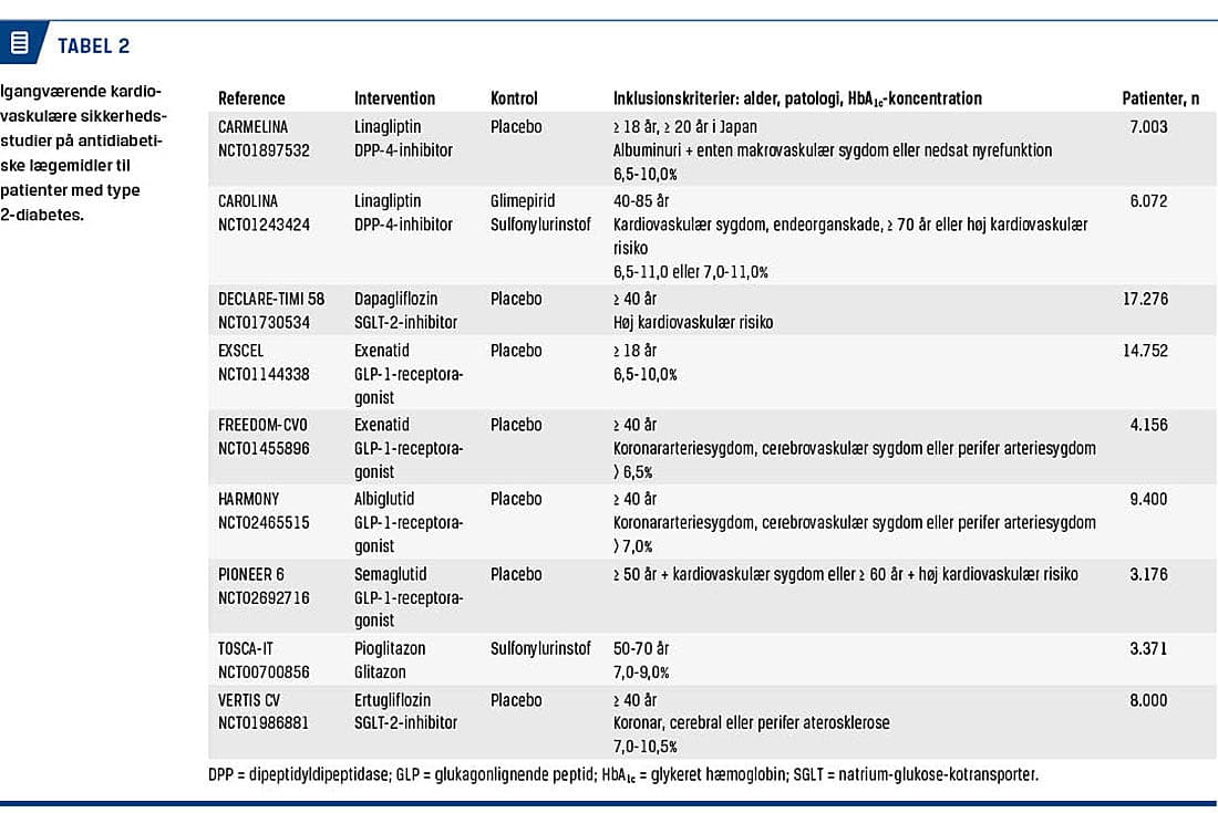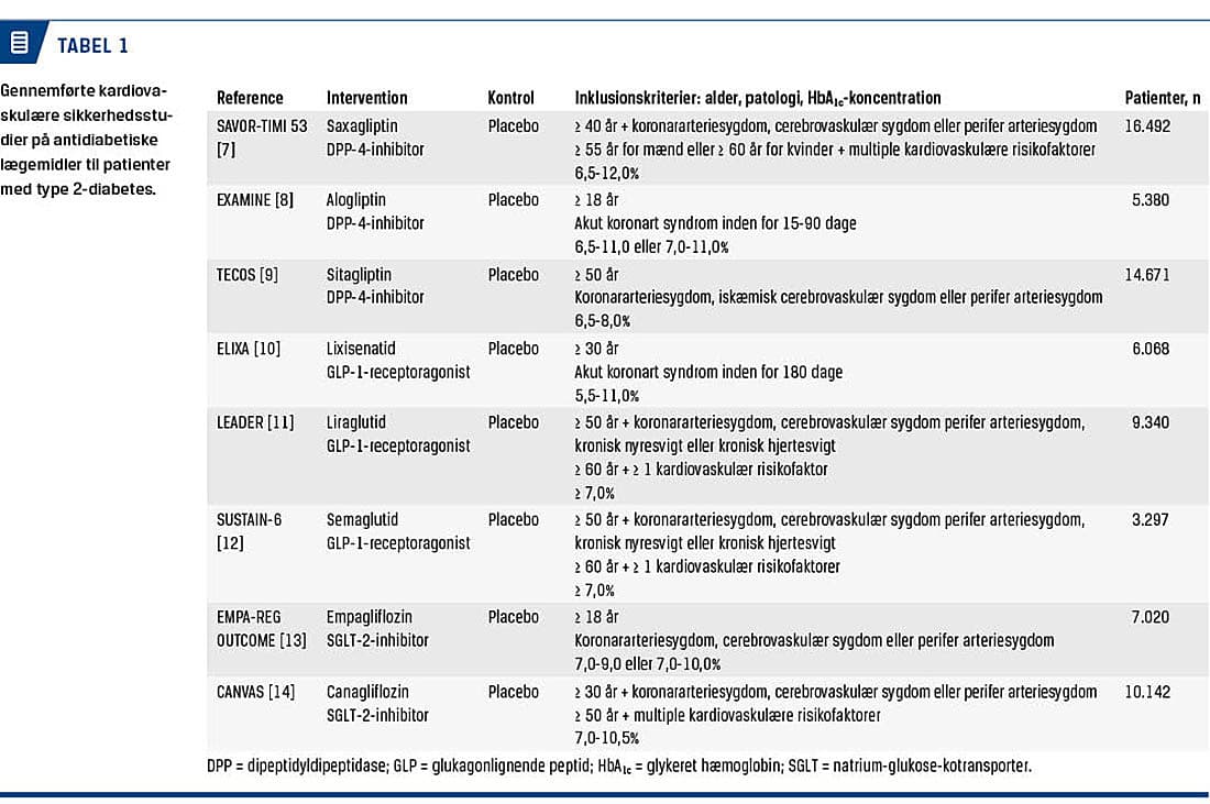 På nuværende tidspunkt er der udført studier af dipeptidyldipeptidase-4 (DPP-4)-inhibitorer, glukagonlignende peptid-1 (GLP-1)-receptoragonister og natrium-glukose-kotransporter-2 (SGLT-2)-inhibitorer. I alle studierne har man inkluderet patienter med type 2-diabetes og enten kendt kardiovaskulær sygdom eller høj risiko herfor. Karakteristika for de enkelte studier ses i Tabel 1. De væsentligste resultater er opsummeret i