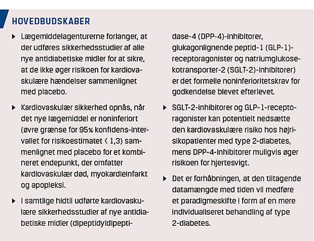 Lægemiddelagenturerne forlanger, at man i kardiovaskulære sikkerhedsstudier af antidiabetiske midler inkluderer patienter med høj risiko for kardiovaskulær sygdom, og at studierne forløber over minimum to år [5, 6]. Kardiovaskulær sikkerhed opnås, når det nye lægemiddel er noninferiort sammenlignet med placebo for et kombineret endepunkt, der omfatter kardiovaskulær død, myokardieinfarkt og apopleksi. Noninferioritet defineres som en øvre grænse for 95% konfidens-intervallet (KI) for risikoestimatet på < 1,3. Ved vær-