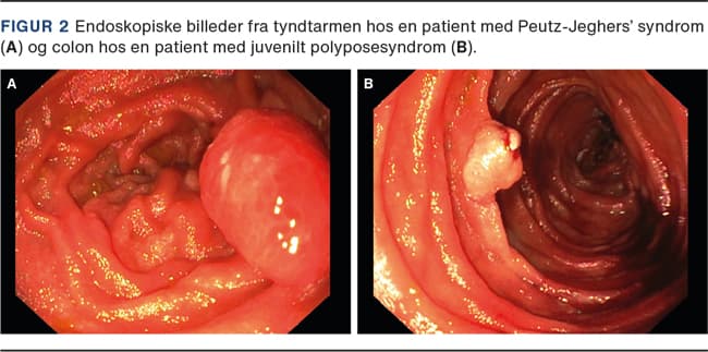Polyposesyndromerne inddeles efter arvegang og histologi. Histologisk kan de klassificeres som hamartomatøse, adenomatøse, serrateellerblandede. De hamartomatøse polyposesyndromeromfatter Peutz-Jeghers’ syndrom, hvor polypperne overvejende er lokaliseret i tyndtarmen, juvenil polypose-syndrom, hvor polypperne typisk findes i tyktarmen og ventriklen, samt PTEN-hamartom-tumorsyndrom, hvor man overvejende ser polypper i tyktarmen. Peutz-Jeghers’ syndrom debuterer ofte før 20-årsalderen og i halvdelen af tilfældene med akut abdomen pga. polypinduceret invagination af tyndtarmen [5]. Karakteristisk for Petuz-Jeghers’ syndrom er desuden mukokutane pigmenteringer, der findes på læberne og i kindslimhinden samt evt. på hænderne og fødderne. Debutsymptomerne ved juvenil polypose-syndrom er ofte mere uspecifikke med mavesmerter og anæmi – og i nogle tilfælde er cancer i tidlig voksenalder det første symptom. En undergruppe af patienter med juvenil polypose-syndrom har patogene varianter i SMAD4 og kan have symptomer på hereditær hæmoragisk telangiektasi med recidiverende epistaxis samt aortopati (torakal aortadilatation/aneurisme) [6]. Ved alle tre syndromer har man en øget kræftrisiko, der er højest ved Peutz-Jeghers’ syndrom, hvor den overordnede kumulative cancerrisiko ved 80 år er på mere end 85% [7]. Det er som oftest – men ikke altid – muligt at påvise en patogen variant i de gener, som er associeret til syndromet.
