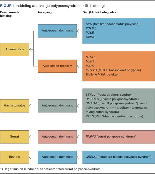 Traditionelt har de arvelige polyposesyndromer været klassificeret efter den dominerende histologi i de fjernede polypper (Figur 1)og den arvegang, som syndromet er nedarvet med. Enkelte af de arvelige polyposesyndromer har været kendt i årtier. Det gælder f.eks. Peutz-Jeghers’ syndrom, juvenilt polyposesyndrom og familiær adenomatøs polypose (FAP), hvor en klassisk præsentation med karakteristiske og/eller multiple polypper i en tidlig alder, evt. en positiv familiehistorie og ekstraintestinale manifestationer har været klinisk let genkendelig. Det har hos en del patienter været muligt at påvise patogene germlinevarianter som årsag til syndromerne, f.eks. patogene varianter i STK11 hos patienter med Peutz-Jeghers’ syndrom og patogene varianter i APC hos patienter med FAP. Udviklingen i den molekylærgenetiske diagnostik har medført, at der over de senere år er identificeret en række nye genetiske årsager til polypose, og disse syndromer har hver deres karakteristika, risici for cancer og ekstraintestinale manifestationer. Dertil kommer, at man med den øgede brug af genetiske analyser ser, at nogle patienter med patogene varianter i velkendte gener har en mildere fænotype.