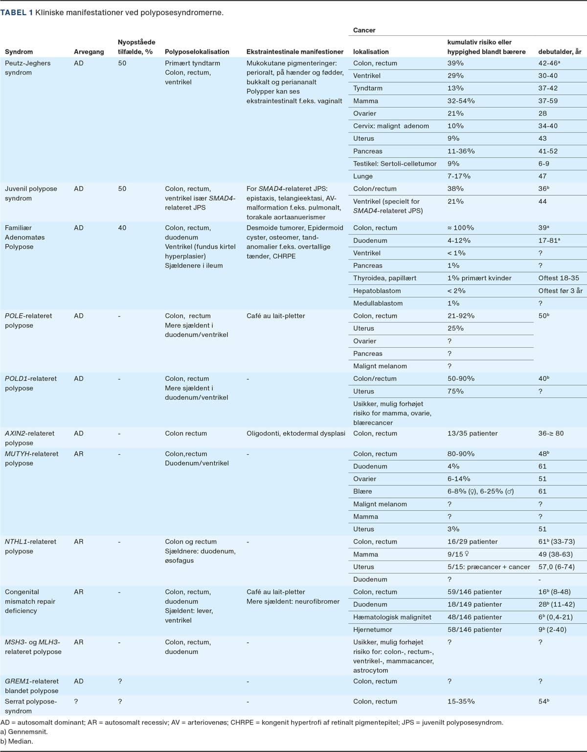 Fund af tarmpolypper ved endoskopiske undersøgelser er hyppige, idet man antager, at 30-50% af befolkningen har en eller flere polypper i tyktarmen efter 50-årsalderen [1]. Som oftest foretages der polypektomi, og patienten kontrolleres efterfølgende i overensstemmelse med gældende retningslinjer for de forskellige underliggende årsager/sygdomme. Polypperne kan dog være en manifestation af et arveligt polyposesyndrom, som er vigtigt at kende, da patienterne og deres familiemedlemmer har en høj risiko for udvikling af kræft i både gastrointestinalkanalen og andre organer. Nogle af syndromerne er også karakteriseret ved ekstraintestinale manifestationer. Behandling og opfølgning afhænger af det tilgrundliggende syndrom.