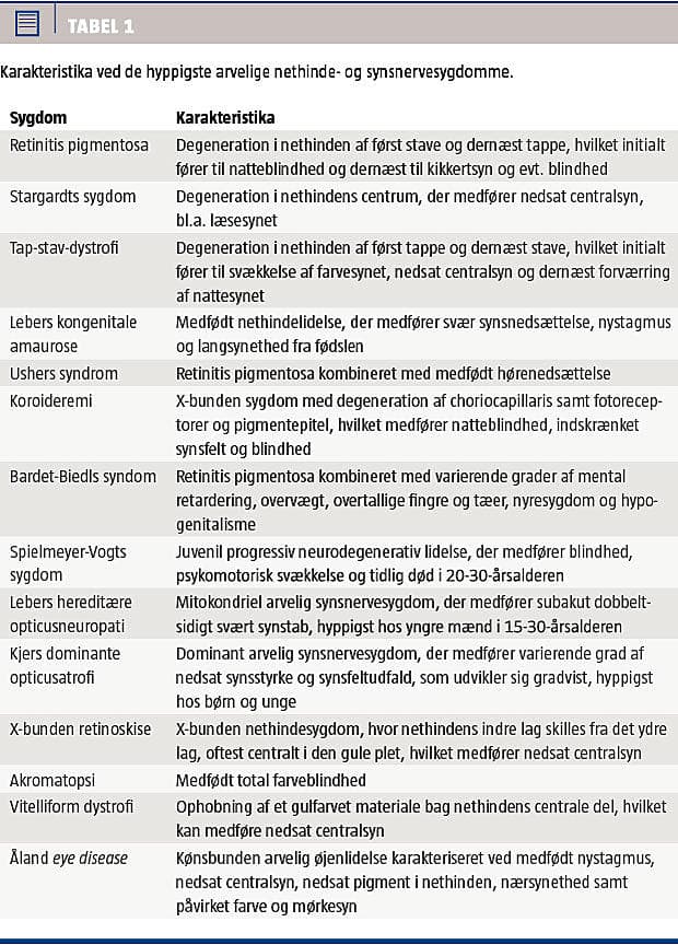 De hidtil uhelbredelige arvelige nethinde- og synsnervesygdomme er af varierende sværhedsgrad, har forskellig debutalder og kan endog optræde fra fødslen. Hos nogle patienter udvikles der svært synstab i den tidlige barndom, mens andre kan være symptomfrie ind i voksenalderen. Sygdommene er overvejende karakteriseret ved langsomtindsættende celledød af specifikke celletyper (Tabel 1).