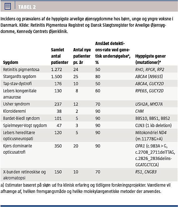 Et skøn over det potentielle behov for indførelse af nye behandlinger af arvelige øjensygdomme hos børn og voksne inden for de nærmeste ti år kan baseres på de landsdækkende genetiske sygdomsregistre på Kennedy Centrets Øjenklinik (tidligere Statens Øjenklinik) (Tabel 2).