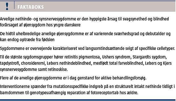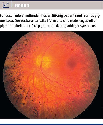 Retinitis pigmentosa er den hyppigste af de monogene degenerative nethindesygdomme (Figur 1). De problemstillinger, der er forbundet med retinitis pigmentosa, er vidtgående repræsentative for problemstillingerne ved de øvrige nethindesygdomme. Ved retinitis pigmentosa er det blandt nethindens fotoreceptorer stavene, dvs. de celler, der er ansvarlige for nattesynet, som først bliver lidende. Siden breder sygdommen sig til tappene og rammer dermed dagssynet, som for patienten er langt vigtigere end nattesynet. Det sker, uanset at den genetiske defekt kun findes i stavene. Stavenes tilstedeværelse er tilsyneladende et nødvendigt trofisk stimulus for vedligeholdelse af tappene [1]. Retinitis pigmentosa er i de nordiske lande den hyppigste årsag til svært synshandikap. I Danmark er retinitis pigmentosa sammen med synsnervedegeneration den hyppigste årsag til arvelig blindhed hos personer på 20-64 år [2].