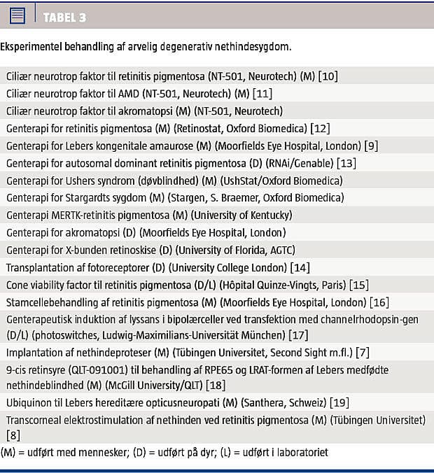Sygdomsspektret inden for gruppen af arvelige nethindesygdomme er meget bredt (Tabel 2), men når der inddeles efter genetiske undertyper og sygdomsstadier med forskelligt behandlingspotentiale, er antallet i hver enkelt af de mange grupper ret begrænset. Dette betinger et udstrakt internationalt samarbejde mellem flere øjengenetiske centre. Igangværende kliniske og prækliniske behandlingsforsøg er opregnet i Tabel 3.