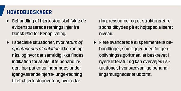 Formålet med denne artikel er at opsummere avancerede eksperimentelle hjertestopbehandlinger, som er beskrevet i The International Consensus on Cardiopulmonary Resuscitation and Emergency Cardiovascular Care Science With Treatment Recommendations statements [3], og som kan overvejes i situationer, hvor genoplivningsalgoritmens sædvanlige behandlingsmuligheder er udtømt.