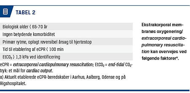 at sandsynligheden for et godt funktionelt udfald efter eCPR-behandling efter præhospitalt hjertestop varierer mellem 4% og 40% [13-15]. Patientselektion og etiske overvejelser er vigtige, da venoarteriel ECMO er forbundet med store logistiske udfordringer, betydelige komplikationer, stort ressourceforbrug og en fortsat ret beskeden sandsynlighed for overlevelse. Visitation til eCPR følger derfor strikte, men ikke evidensbaserede kriterier (Tabel 2). Nyere resultater tyder på, at eCPR kan øge tilbuddet af organer til donation. I en nyligt publiceret oversigtsartikel rapporterede man, at 19% blev organdonorer efter opfyldelse af hjernedødskriteriet [15]. Dette aspekt indgår endnu ikke i beslutningstagningen om eCPR i Danmark.