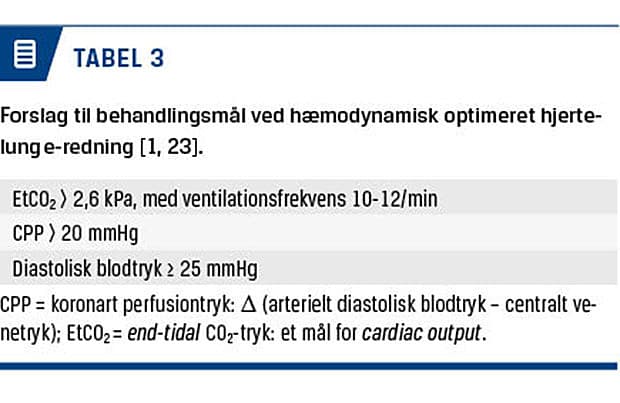 EtCO2 er et indirekte et mål for cardiac output. I forbindelse med hjertestop er vedvarende højere (> 2,6 kPa) værdier indikator for sufficient HLR, og abrupte stigninger kan være tegn på ROSC, mens EtCO2-målinger under 1,3 kPa er forbundet med undladelse af genoplivning [1, 22]. Koronart perfusiontryk (CPP) udgøres af gradienten mellem højre atriums diastoliske tryk og det diastoliske tryk ved aortaroden, hvilket svarer til relaksationsfasen ved brystkompression. I praksis beregnes CPP som forskellen mellem det centrale venetryk (CVP) og det arterielle diastoliske tryk (dBT) (CPP = dBT – CVP). American Heart Association og ERC anbefaler, at HLR målrettes mod et CPP ≥ 20 mmHg og dBT > 25 mmHg (Tabel 3) vha. optimerede brystkompressioner (dybde og frekvens) og vasopressorer, hvilket kræver anlæggelse af arteriekanyle og evt. centralt venekateter [1, 23]. Flere dyrestudier har vist, at hæmodynamisk målrettet aHLR mod højere CPP er associeret til større sandsynlighed for ROSC samt højere cerebralt perfusionstryk og ilttension i hjernevævet [24-26]. Et observationelt studie har vist en positiv korrelation mellem højere CPP og ROSC (CPP 8,4 ± 10,0 mmHg vs. 25,6 ± 7,7 mmHg) [27].