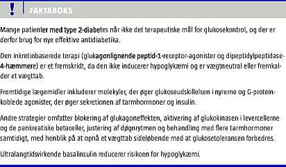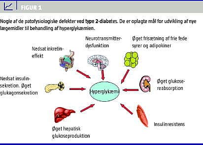 Type 2-diabetes er en progressiv sygdom, der er karakteriseret ved varierende grader af defekt insulinsekretion og insulinresistens i lever og muskler, hvilket medfører øget glukoseproduktion fra leveren og nedsat perifer glukoseoptagelse [1]. Overvægt og fedme bidrager til patofysiologien via en øget frisætning af frie fede syrer og adipokiner, der inducerer »lavaktivitetsinflammation", som medfører insulinresistens og deltager i betacelledestruktionen [1]. En defekt insulinotropisk effekt af de to inkretinhormoner glukagonlignende peptid (GLP)-1 og glukoseafhængig insulinotropt polypeptid (GIP) bidrager i samspil med en øget frisætning af glukagon også til hyperglykæmi ved type 2-diabetes [1]. Dysfunktion af neurotransmittere og en abnorm døgnrytme synes også at spille en rolle i patofysiologien [1]. På trods af behandling med flere antidiabetika opnår mange af patienterne ikke det terapeutiske mål for glukosekontrollen. Endvidere har antidiabetika bivirkninger i form af risiko for hypoglykæmi, vægtstigning, væskeretention, frakturer og gastrointestinale gener, og der er derfor stor interesse for at udvikle nye effektive antidiabetika [2]. Høje priser på de nye præparater kan begrænse rationel anvendelse af dem hos en del patienter.