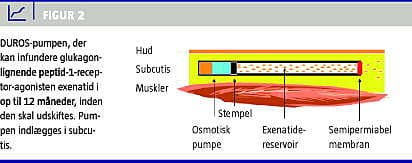 Flere GLP-1-RA til subkutan dosering 1 × ugentlig er i øjeblikket under udvikling [4]. Andre applikationsveje, der undersøges, er oral, kutan, nasal og pulmonal administration, uden at der dog er præsenteret overbevisende resultater i relation til reduktion af HbA 1c -koncentrationen eller vægt. Et interessant koncept er brugen af en lille osmotisk drevet pumpe (DUROS) på 4,5 × 45 mm, der indlægges i subcutis, og som kontinuerligt kan infundere exenatid i 3-12 måneder, før den skal udskiftes (Figur 2 ).