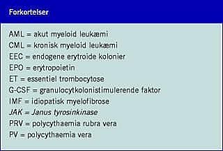 De kroniske myeloproliferative sygdomme består ifølge den nye WHO-klassifikation ikke kun af kronisk myeloid leukæmi (CML), essentiel trombocytose (ET), polycythaemia vera (PV) og idiopatisk myelofibrose (IMF), men også af kronisk neutrofil leukæmi, kronisk eosinofil leukæmi, det hypereosinofile syndrom og en uklassificerbar gruppe [1]. Sygdommene er erhvervede klonale stamcellesygdomme, karakteriseret ved klonal myeloproliferation med bevaret differentiering og opmodning. Splenomegali forekommer ofte ved især IMF som følge af ekstramedullær hæmatopoiese (myeloid metaplasi). Et andet fælles karakteristikum er risikoen for tiltagende klonal evolution og progression mod knoglemarvsinsufficiens med baggrund i defekt hæmatopoiese og myelofibrose og ultimativt udvikling af den akutte blastkrise, som fænotypisk næsten altid er akut myeloid leukæmi (AML).