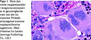 Diagnostikken af de »klassiske« kroniske myeloproliferative sygdomme (PV, IMF, ET, CML) er kompliceret af betydelige overlap i de kliniske, biokemiske og histopatologiske fund. Således ses varierende leuko- og trombocytose næsten altid. I knoglemarven er der en øget forekomst af abnorme megakaryocytter (Figur 1 ), og sekundære stromaforandringer i form af en øget bindevævsdannelse samt karnydannelse (neoangiogenese) er særlig karakteristisk. Dertil kommer, at PV og ET undertiden kan være vanskelige at skelne fra de sekundære/reaktive erytro/trombocytoser. Mens CML er en veldefineret sygdom kendetegnet ved forekomsten af Philadelphiakromosomet (translokation t(9;22)), har de tre øvrige myeloproliferative sygdomme (ET, PV og IMF) ingen specifikke kromosomabnormiteter. Selv om kromosomforandringer også ses ved ET (ca. 5-10%) og IMF (op til 60%), indgår en abnorm karyotype kun som selvstændigt diagnostisk kriterium ved PV [2], hvor det mest konsistente fund er den egenskab ved de hæmatopoietiske progenitorcellers, at de kan proliferere i et medium uden eksogent erytropoietin (EPO) [3]. Dette fænomen er benævnt endogene erytroide kolonier (EEC) og kan også ses hos en subgruppe af ET- og IMF-patienter [4, 5].