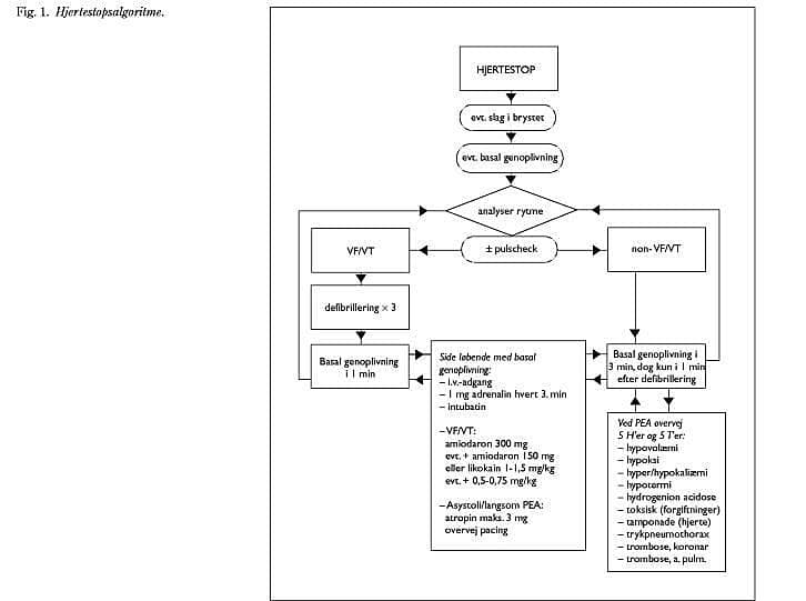 Asystoli og PEA har begge en meget dårlig prognose, overlevelse til udskrivelse er for asystoli nær 0% og for PEA 1-4% (10). PEA, der er udløst af terapeutisk reversible tilstande, skal overvejes, afklares og behandles (Fig. 1 ).