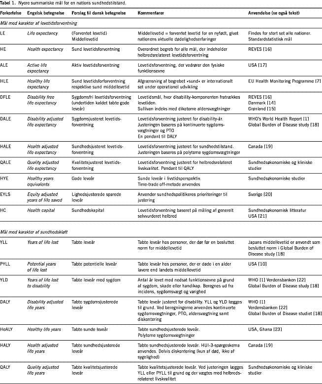 Med offentliggørelsen af WHO's World Health Report 2000 [1] omtales nye mål for en nations sundhedstilstand bl.a. disability-adjusted life expectancy og disability-adjusted life years . WHO-rapporten har været meget diskuteret i den danske offentlighed. I den internationale litteratur er der igennem en årrække fremkommet forslag til nye mål for en nations sundhedstilstand. Disse mål har stort set ikke været omtalt i Danmark. Det er vor erfaring, at meget få personer i sundhedssektoren har overblik over de begreber og mål som benyttes, når man måler og drøfter en nations sundhedstilstand. På denne baggrund er formålet med artiklen at give en begrebsmæssig oversigt over gamle og nye mål for en nations sundhedstilstand med særlig vægt på de nyere mål, som tilstræber at sammenveje mortalitetsdimensionen med morbiditets-, funktions- eller livskvalitetsdimensionen.