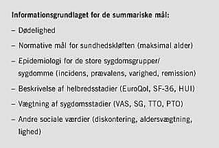 I alt indebærer summariske mål kvantificering af både dødelighed, sygelighed og helbredsrelateret livskvalitet samt politiske normforudsætninger.